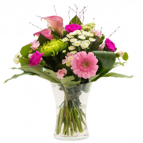 A lovely bright flower hand tied to bring a smile. Pinks, Whites and Greens. Simple and beautiful. Vase not included.